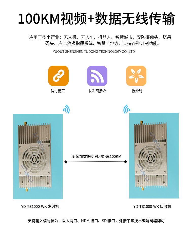 YD-TS1000-WK  是應用于無人機行業的圖數控一體化超遠距離無線傳輸設備(最遠可達 15至20 公里),具有體積小、功耗低、通信距離遠等特點,支持高清視頻、飛控數據、云臺控制數據、遙控器控制數據等同時傳輸。