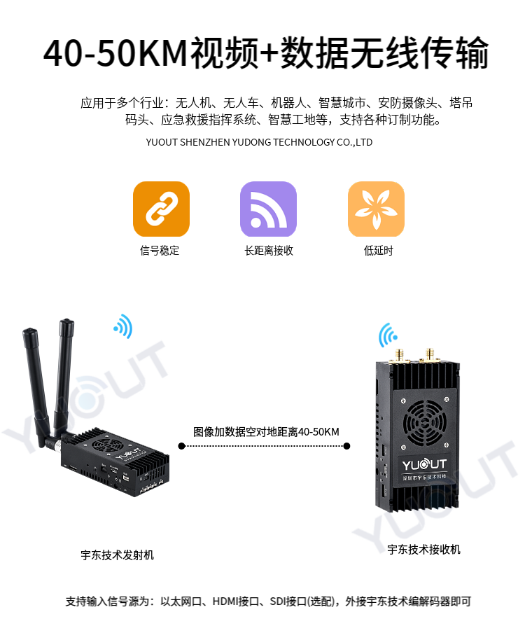 YD-TS0050-WK 是應用于無人機行業的圖數控一體化超遠距離無線傳輸設備(最遠可達 40至50 公里),具有體積小、功耗低、通信距離遠等特點,支持高清視頻、飛控數據、云臺控制數據、遙控器控制數據等同時傳輸。