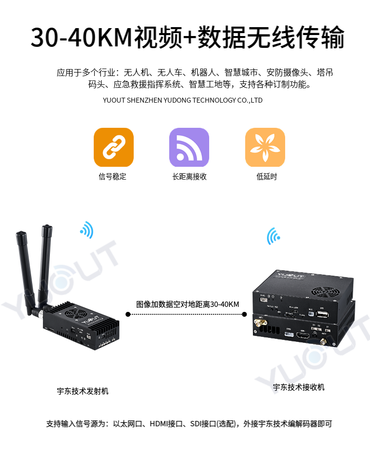 YD-TS0030-WK 是應用于無人機行業(yè)的圖數控一體化超遠距離無線傳輸設備(最遠可達 30至40 公里),具有體積小、功耗低、通信距離遠等特點,支持高清視頻、飛控數據、云臺控制數據、遙控器控制數據等同時傳輸。