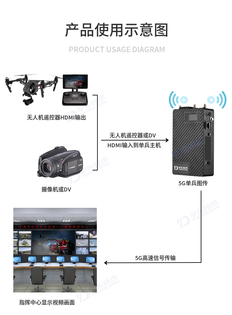 YD-GB8010-5G便攜式5G單兵圖傳高清視頻終端采用嵌入式系統架構,采用高性能H.264/H.265編解碼處理器設計。設備支持視頻采集、編碼壓縮、傳輸、雙向對講功能。